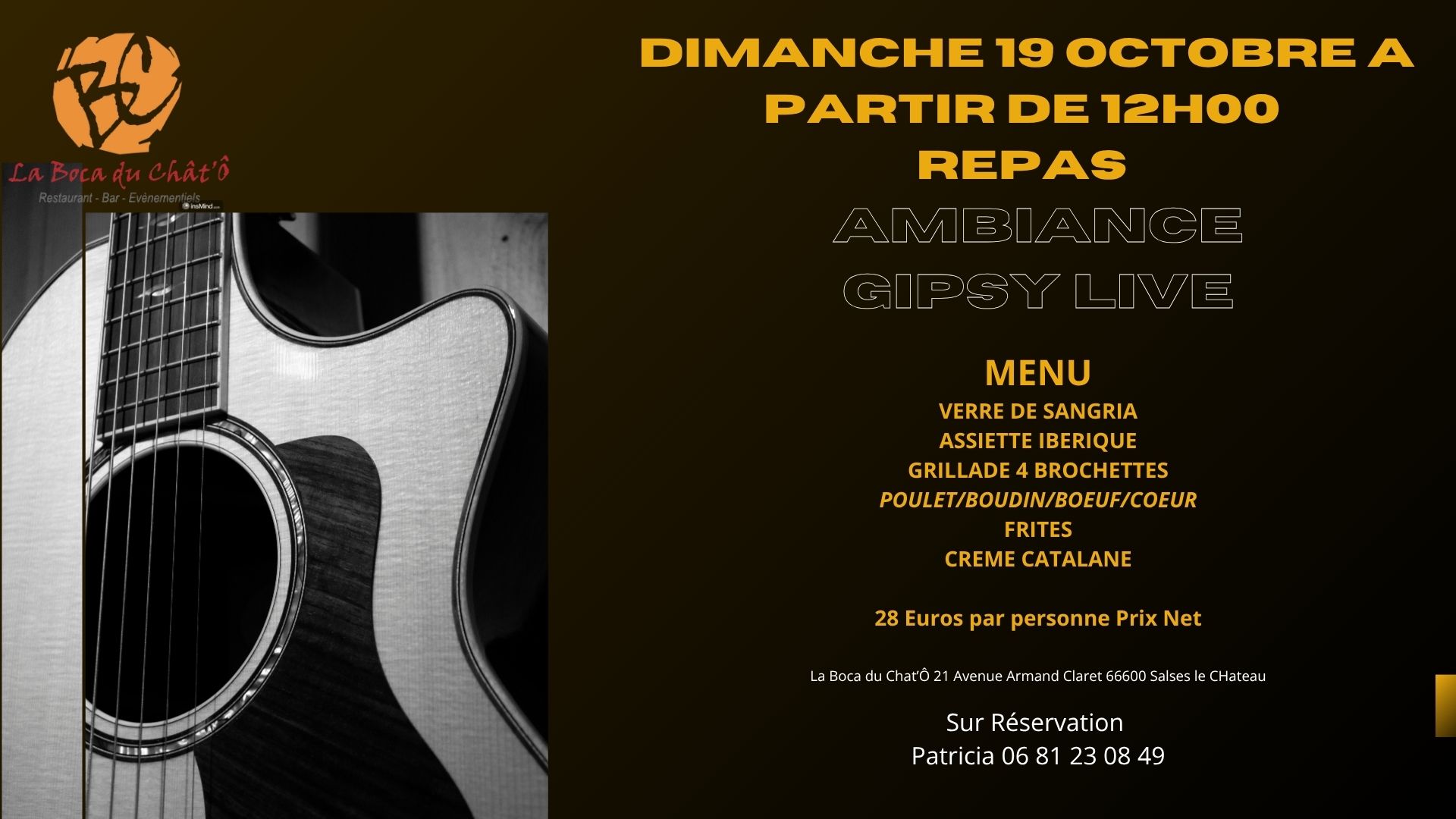 Repas Musical animé par Daniel et sa guitare ambiance Gipsy le Dimanche 19 Octobre 2025 à partir de 12H00 où vous serez accueillis par Patricia et toute son équipe. Un lieu à découvrir absolument !!!!